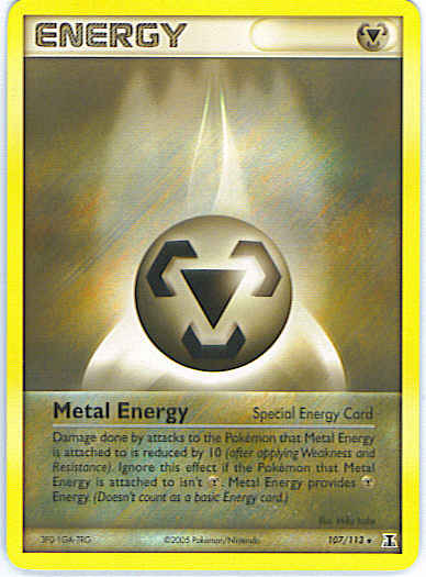 Damage done by attacks to the Pokemon that Metal Energy is attached to is reduced by 10 (after applying Weakness and Resistance). Ignore this effect if the Pokemon that Metal Energy is attached to isn't M. Metal Energy provides M Energy. (Doesn't count as a basic Energy card.)