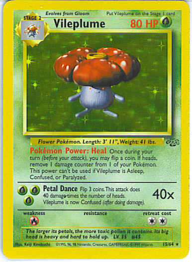 Evne [GGG] Petal Dance (40x) Flip 3 coins. This attack does 40 damage times the number of heads. Vileplume is now Confused (after doing damage).