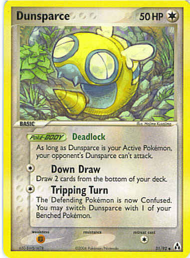 | Type | Colorless | | Pokemon serie | Legend Maker | | Stadie | Basic | | HP | 50 | | Sjældenhed | Uncommon | | Tilbagetrækning | 1 | | Svaghed | F | | Kortnummer | 31 | | Evne | [C] Down Draw - Draw 2 cards from the bottom of your deck. [C] Tripping Turn - The Defending Pokemon is now Confused. You may switch Dunspace with 1 of your Benched Pokemon. | | Evne2 | [C] Down Draw - Draw 2 cards from the bottom of your deck. [C] Tripping Turn - The Defending Pokemon is now Confused. You may switch Dunspace with 1 of your Benched Pokemon. | | Kunstner | Hajime Kusajima |