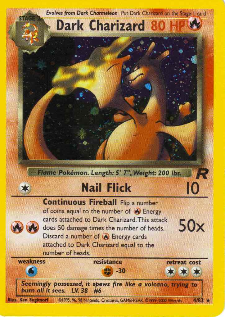 [RR] Continuous Fireball (50x) Flip a number of coins equal to the number of R Energy cards attached to Dark Charizard. This attack does 50 damage times the number of heads. Discard a number of R Energy cards attached to Dark Charizard equal to the number of heads.