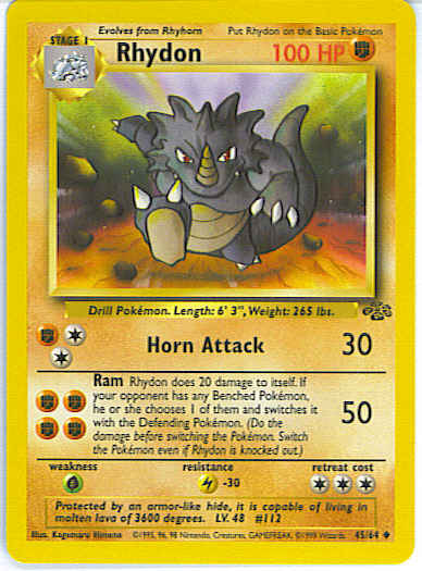 [FFFF] Ram (50) Rhydon does 20 damage to itself. If your opponent has any Benched Pokemon, he or she chooses 1 of them and switches it with the Defending Pokemon. (Do the damage before switching the Pokemon. Switch the Pokemon even if Rhydon is knocked out.)