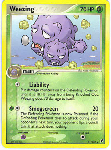 | Type | Grass | | Pokemon serie | Deoxys | | Stadie | Stage 1 | | HP | 70 | | Sjældenhed | Uncommon | | Tilbagetrækning | 1 | | Svaghed | P | | Kortnummer | 51 | | Evne | [C] Liability - Put damage counters on the Defending Pokemon until it is 10 HP away from being Knocked Out. Weezing does 70 damage to itself. [CG] Smogscreen (20) The Defending Pokemon is now Poisoned. If the Defending Pokemon tries to attack during your opponent's next turn, your opponent flips a coin. If tails, that attack does nothing. | | Evne2 | [C] Liability - Put damage counters on the Defending Pokemon until it is 10 HP away from being Knocked Out. Weezing does 70 damage to itself. [CG] Smogscreen (20) The Defending Pokemon is now Poisoned. If the Defending Pokemon tries to attack during your opponent's next turn, your opponent flips a coin. If tails, that attack does nothing. | | Kunstner | Hisao Nakamura |