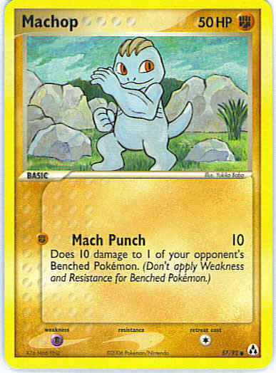 | Type | Fighting | | Pokemon serie | Legend Maker | | Stadie | Basic | | HP | 50 | | Sjældenhed | Common | | Tilbagetrækning | 1 | | Svaghed | P | | Kortnummer | 57 | | Evne | [F] Mach Punch (10) Does 10 damage to 1 of your opponent's Benched Pokemon. (Don't apply Weakness and Resistance for Benched Pokemon.) | | Evne2 | [F] Mach Punch (10) Does 10 damage to 1 of your opponent's Benched Pokemon. (Don't apply Weakness and Resistance for Benched Pokemon.) | | Kunstner | Yukiko Baba |