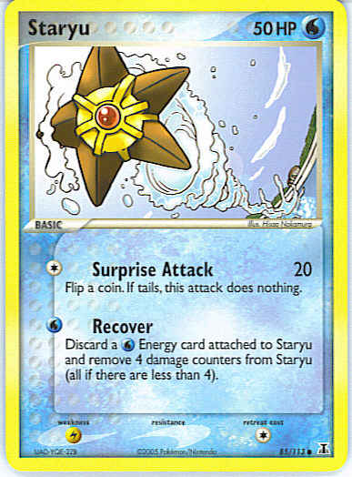 | Type | Water | | Pokemon serie | Delta Species | | Stadie | Basic | | HP | 50 | | Sjældenhed | Common | | Tilbagetrækning | 1 | | Svaghed | L | | Kortnummer | 85 | | Evne | [C] Surprise Attack (20) Flip a coin. If tails, this attack does nothing. [W] Recover - Discard a W Energy card attached to Staryu and remove 4 damage counters from Staryu (all if there are less than 4). | | Evne2 | [C] Surprise Attack (20) Flip a coin. If tails, this attack does nothing. [W] Recover - Discard a W Energy card attached to Staryu and remove 4 damage counters from Staryu (all if there are less than 4). | | Kunstner | Hisao Nakamura |