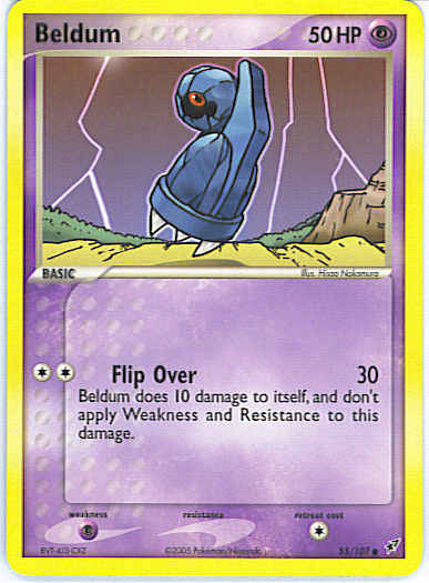 | Type | Psychic | | Pokemon serie | Deoxys | | Stadie | Basic | | HP | 50 | | Sjældenhed | Common | | Tilbagetrækning | 1 | | Svaghed | P | | Kortnummer | 55 | | Evne | [CC] Flip Over (30) Beldum does 10 damage to itself, and don't apply Weakness and Resistance to this damage. | | Evne2 | [CC] Flip Over (30) Beldum does 10 damage to itself, and don't apply Weakness and Resistance to this damage. | | Kunstner | Hisao Nakamura |