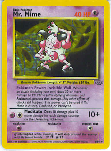 | Type | Psychic | | Pokemon serie | Jungle | | Stadie | Basic | | HP | 40 | | Sjældenhed | Rare | | Tilbagetrækning | 1 | | Svaghed | P | | Kortnummer | 6 | | Evne | of attacks still happen.) This power can't be used if Mr. Mime is Asleep, Confused, or Paralyzed.