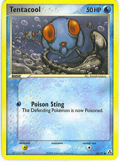 | Type | Water | | Pokemon serie | Legend Maker | | Stadie | Basic | | HP | 50 | | Sjældenhed | Common | | Tilbagetrækning | 1 | | Svaghed | L | | Kortnummer | 66 | | Evne | [W] Poison Sting - The Defending Pokemon is now Poisoned. | | Evne2 | [W] Poison Sting - The Defending Pokemon is now Poisoned. | | Kunstner | Tomoaki Imakuni |