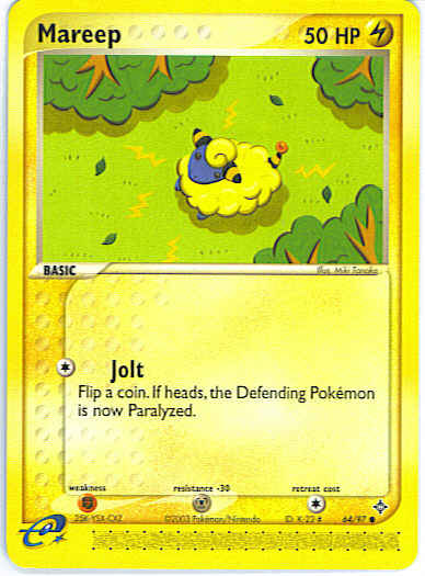 | Type | Lightning | | Pokemon serie | Dragon | | Stadie | Basic | | HP | 50 | | Sjældenhed | Common | | Tilbagetrækning | 1 | | Modstand | M | | Svaghed | F | | Kortnummer | 64 | | Evne | [C] Jolt - Flip a coin. If heads, the Defending Pokemon is now Paralyzed. | | Evne2 | [C] Jolt - Flip a coin. If heads, the Defending Pokemon is now Paralyzed. | | Kunstner | Miki Tanaka |