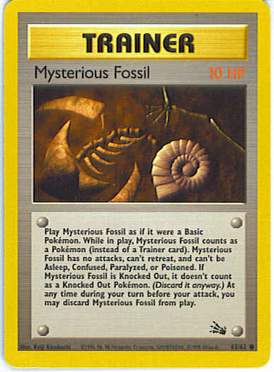Evne Play Mysterious Fossil as if it were a Basic Pokemon. While in play, Mysterious Fossil counts as a Pokemon (instead of a Trainer card). Mysterious Fossil has no attacks, can't retreat, and can't be Asleep, Confused, Paralyzed, or Poisoned. If Mysterious Fossil is Knocked Out, it doesn't count as a Knocked Out Pokemon. (Discard it anyway.) At any time during your turn before your attack, you may discard Mysterious Fossil from play.