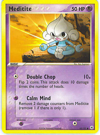 | Type | Psychic | | Pokemon serie | Hidden Legends | | Stadie | Basic | | HP | 50 | | Sjældenhed | Common | | Tilbagetrækning | 1 | | Svaghed | P | | Kortnummer | 65 | | Evne | [C] Double Chop (10x) Flip 2 coins. This attack does 10 damage times the number of heads. [P] Calm Mind - Remove 2 damage counters from Meditite (remove 1 if there is only 1). | | Evne2 | [C] Double Chop (10x) Flip 2 coins. This attack does 10 damage times the number of heads. [P] Calm Mind - Remove 2 damage counters from Meditite (remove 1 if there is only 1). | | Kunstner | Ken Sugimori |