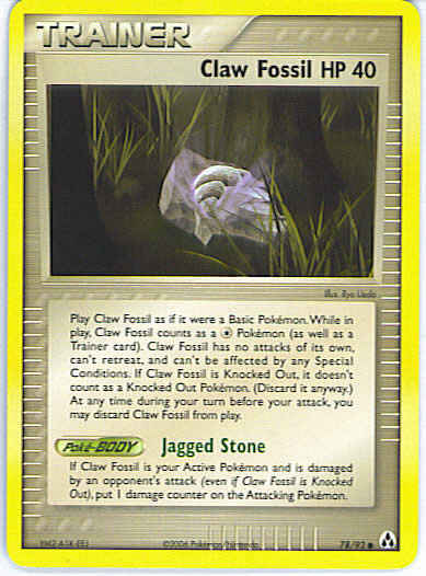 Play Claw Fossil as if it were a Basic Pokemon. While in play, Claw Fossil counts as a C Pokemon (as well as a Trainer card). Claw Fossil has no attacks of its own, can't retreat, and can't be affected by any Special Conditions. If Claw Fossil is Knocked Out, it doesn't count as a Knocked Out Pokemon. (Discard it anyway.) At any time during your turn before your attack, you may discard Claw Fossil from play.