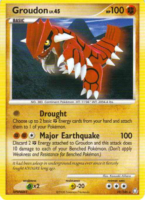 [CFF] Major Earthquake (100) Discard 2 F Energy attached to Groudon and this attack does 10 damage to each of your Benched Pokemon. (Don't apply Weakness and Resistance Pokemon.)