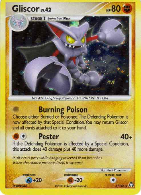 Evne [0] Burning Poison - Choose either Burned or Poisoned. The Defending Pokemon is now affected by that Special Condition. You may return Gliscor and all cards attached to it to your hand.