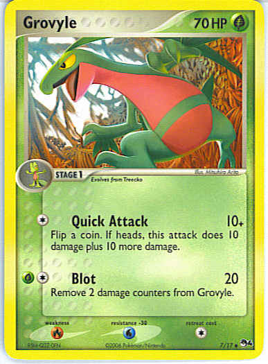 | Type | Grass | | Pokemon serie | OP Series 4 | | Stadie | Stage 1 | | HP | 70 | | Sjældenhed | Uncommon | | Tilbagetrækning | 1 | | Modstand | W | | Svaghed | R | | Kortnummer | 7 | | Evne | [C] Quick Attack (10+) Flip a coin. If heads, this attack does 10 damage plus 10 more damage. [CG] Blot (20) Remove 2 damage counters from Grovyle.