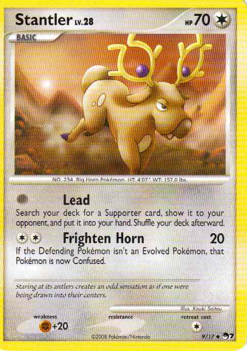 | Type | Colorless | | Pokemon serie | OP Series 7 | | Stadie | Basic | | HP | 70.0 | | Sjældenhed | Uncommon | | Tilbagetrækning | 1.0 | | Svaghed | F+20 | | Kortnummer | 9 | | Evne | [0] Lead - Search your deck for a Supporter card, show it to your opponent, and put it into your hand. Shuffle your deck afterward. [CC] Frighten Horn (20) If the Defending Pokemon isn't an Evolved Pokemon, that Pokemon is now Confused.