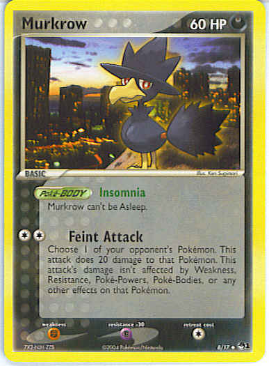 | Type | Darkness | | Pokemon serie | OP Series 1 | | Stadie | Basic | | HP | 60 | | Sjældenhed | Uncommon | | Tilbagetrækning | 1 | | Modstand | P | | Svaghed | F | | Kortnummer | 8 | | Evne | [CC] Feint Attack - Choose 1 of your opponent's Pokemon. This attack does 20 damage to that Pokemon. This attack's damage isn't affected by Weakness, Resistance, Poke-Powers, Poke-Bodies, or any other effects on that Pokemon.