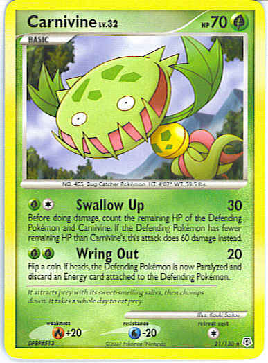 [CG] Swallow Up (30) Before doing damage, count the remaining HP of the Defending Pokemon and Carnivine. If the Defending Pokemon has fewer remaining HP than Carnivine's, this attack does 60 damage instead.