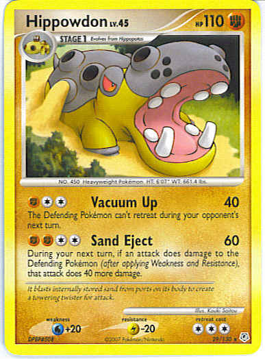 | Type | Fighting | | Pokemon serie | Diamond and Pearl | | Stadie | Stage 1 | | HP | 110 | | Sjældenhed | Rare | | Tilbagetrækning | 3 | | Modstand | L-20 | | Svaghed | W+20 | | Kortnummer | 29 | | Evne |