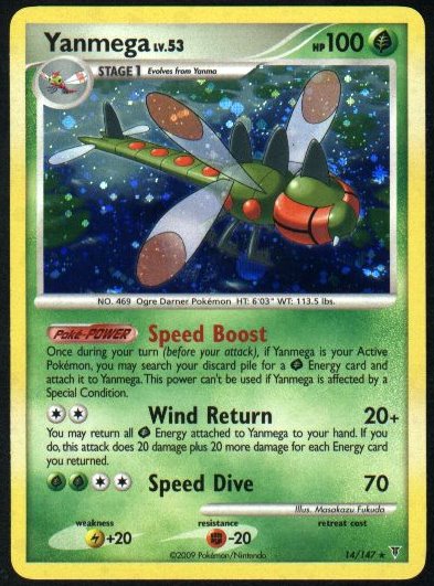 Evne [CC] Wind Return (20+) You may return all Grass Energy attached to Yanmega to your hand. If you do, this attack does 20 damage plus 20 more damage for each Energy card you returned.