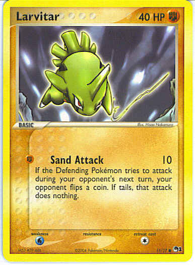 | Type | Fighting | | Pokemon serie | OP Series 1 | | Stadie | Basic | | HP | 40 | | Sjældenhed | Common | | Tilbagetrækning | 1 | | Svaghed | W | | Kortnummer | 11 | | Evne | [F] Sand Attack (10) If the Defending Pokemon tries to attack during your opponent's next turn, your opponent flips a coin. If tails, that attack does nothing.