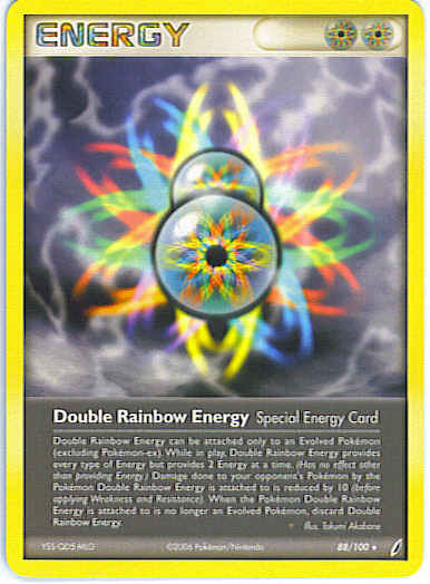 Evne Double Rainbow Energy can be attached only to an Evolved Pokemon (excluding Pokemon-ex). While in play, Double Rainbow Energy provides every type of Energy but provides 2 Energy at a time. (Has no effect other than providing Energy.) Damage done to your opponent's Pokemon by the Pokemon Double Rainbow Energy is attached to is reduced by 10 (before applying Weakness and Resistance). When the Pokemon Double Rainbow Energy is attached to is no longer an Evolved Pokemon, discard Double Rainbow Energy.