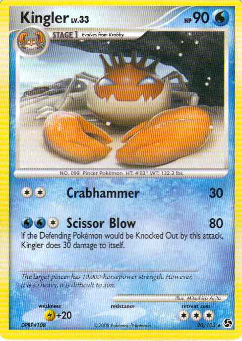 | Type | Water | | Pokemon serie | Great Encounters | | Stadie | Stage 1 | | HP | 90.0 | | Sjældenhed | Rare | | Tilbagetrækning | 3.0 | | Svaghed | L+20 | | Kortnummer | 20 | | Evne | [CC] Crabhammer (30) [CWW] Scissor Blow (80) If the Defending Pokemon would be Knocked Out by this attack, Kingler does 30 damage to itself.