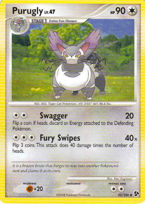 | Type | Colorless | | Pokemon serie | Great Encounters | | Stadie | Stage 1 | | HP | 90.0 | | Sjældenhed | Uncommon | | Tilbagetrækning | 2.0 | | Svaghed | F+20 | | Kortnummer | 50 | | Evne | [CC] Swagger (20) Flip a coin. If heads, discard an Energy attached to the Defending Pokemon. [CCC] Fury Swipes (40x) Flip 3 coins. This attack does 40 damage times the number of heads.