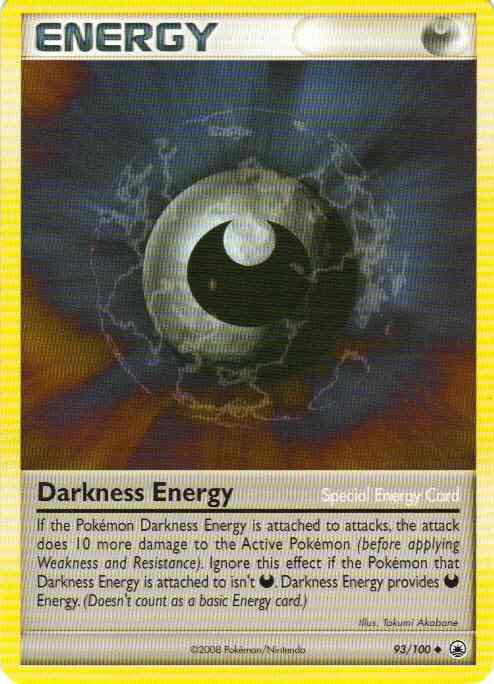 If the Pokemon Darkness Energy is attached to attacks, the attack does 10 more damage to the Active Pokemon (before applying Weakness and Resistance). Ignore this effect if the Pokemon that Darkness Energy is attached to isn't Dark. Darkness Energy provides D Energy. (Doesn't count as a basic Energy card.) (Major text change in Ruby/Sapphire. Using earlier versions requires reference.)