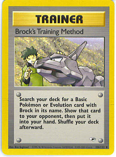Evne Search your deck for a Basic Pokemon or Evolution card with Brock in its name. Show that card to your opponent, then put it into your hand. Shuffle your deck afterward.