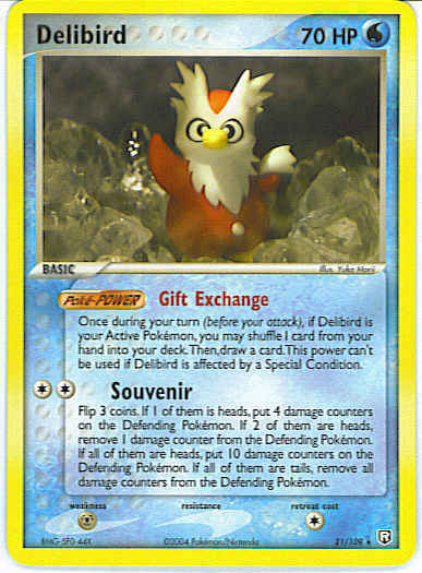 | Type | Water | | Pokemon serie | Team Rocket Returns | | Stadie | Basic | | HP | 70 | | Sjældenhed | Rare | | Tilbagetrækning | 1 | | Svaghed | M | | Kortnummer | 21 | | Evne | [CC] Souvenir - Flip 3 coins. If 1 of them is heads, put 4 damage counters on the Defending Pokemon. If 2 of them are heads, remove 1 damage counter from the Defending Pokemon. If all of them are heads, put 10 damage counters on the Defending Pokemon. If all of them are tails, remove all damage counters from the Defending Pokemon. | | Evne2 | [CC] Souvenir - Flip 3 coins. If 1 of them is heads, put 4 damage counters on the Defending Pokemon. If 2 of them are heads, remove 1 damage counter from the Defending Pokemon. If all of them are heads, put 10 damage counters on the Defending Pokemon. If all of them are tails, remove all damage counters from the Defending Pokemon. | | Kunstner | Yuka Morii |