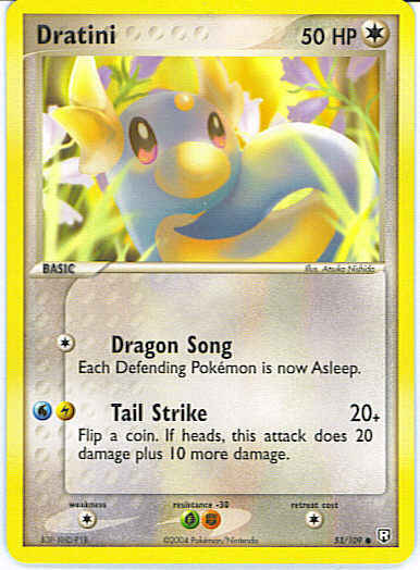 | Type | Colorless | | Pokemon serie | Team Rocket Returns | | Stadie | Basic | | HP | 50 | | Sjældenhed | Common | | Tilbagetrækning | 1 | | Modstand | FG | | Svaghed | C | | Kortnummer | 53 | | Evne | [C] Dragon Song - Each Defending Pokemon is now Asleep. [LW] Tail Strike (20+) Flip a coin. If heads, this attack does 20 damage plus 10 more damage. | | Evne2 | [C] Dragon Song - Each Defending Pokemon is now Asleep. [LW] Tail Strike (20+) Flip a coin. If heads, this attack does 20 damage plus 10 more damage. | | Kunstner | Atsuko Nishida |