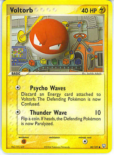 | Type | Lightning | | Pokemon serie | Team Rocket Returns | | Stadie | Basic | | HP | 40 | | Sjældenhed | Common | | Tilbagetrækning | 1 | | Svaghed | F | | Kortnummer | 80 | | Evne | [C] Psycho Waves - Discard an Energy card attached to Voltorb. The Defending Pokemon is now Confused. [C] Thunder Wave (10) Flip a coin. If heads, the Defending Pokemon is now Paralyzed. | | Evne2 | [C] Psycho Waves - Discard an Energy card attached to Voltorb. The Defending Pokemon is now Confused. [C] Thunder Wave (10) Flip a coin. If heads, the Defending Pokemon is now Paralyzed. | | Kunstner | Sachiko Adachi |
