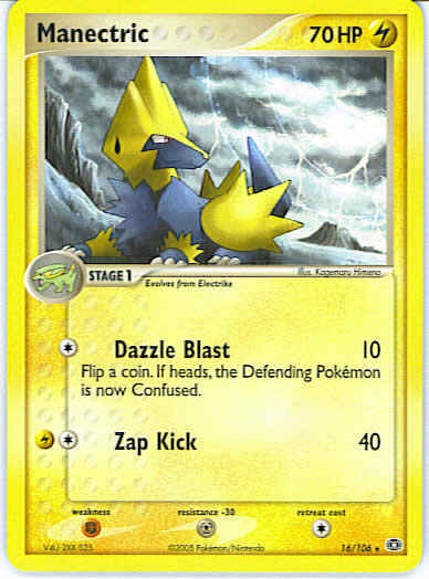 | Type | Lightning | | Pokemon serie | Emerald | | Stadie | Stage 1 | | HP | 70 | | Sjældenhed | Rare | | Tilbagetrækning | 1 | | Modstand | M | | Svaghed | F | | Kortnummer | 16 | | Evne |