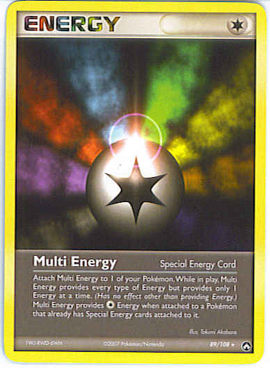 Evne Attach Multi Energy to 1 of your Pokemon. While in play, Multi Energy provides every type of Energy but provides only 1 Energy at a time. (Has no effect other than providing Energy.) Multi Energy provides C Energy when attached to a Pokemon that already has Special Energy cards attached to it.