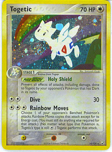 | Type | Colorless | | Pokemon serie | Team Rocket Returns | | Stadie | Stage 1 | | HP | 70 | | Sjældenhed | Rare | | Tilbagetrækning | 1 | | Modstand | F | | Svaghed | L | | Kortnummer | 14 | | Evne | of attacks, including damage, done to Togetic by your opponent's Pokemon that has Dark in its name. (Poke-BODY)