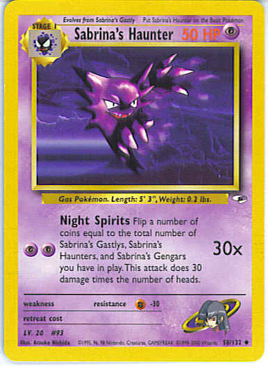Evne [PP] Night Spirits (30x) Flip a number of coins equal to the total number of Sabrina's Gastlys, Sabrina's Haunters, and Sabrina's Gengars you have in play. This attack does 30 damage times the number of heads.
