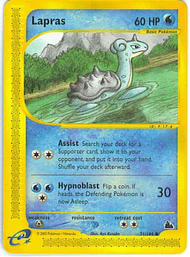 | Type | Water | | Pokemon serie | Skyridge | | Stadie | Basic | | HP | 60 | | Sjældenhed | Common | | Tilbagetrækning | 2 | | Svaghed | M | | Kortnummer | 71 | | Evne | [CC] Assist - Search your deck for a Supporter card, show it to your opponent and put it into your hand. Shuffle your deck afterward. [CWW] Hypnoblast (30) Flip a coin. If heads, the Defending Pokemon is now Asleep