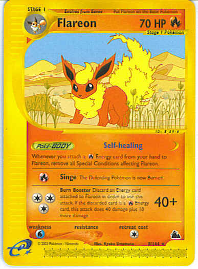 | | Evne2 | [R] Singe - The Defending Pokemon is now Burned. [CCC] Burn Booster (40+) Discard an Energy card attached to Flareon in order to use this attack. If the discarded card is a R Energy card, this attack does 40 damage plus 10 more damage.