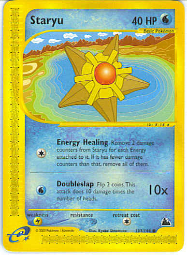 | | Evne2 | [C] Energy Healing - Remove 2 damage counters from Staryu for each energy attached to it. If it has fewer damage counters than that, remove all of them. [W] Doubleslap (10x) Flip 2 coins. This attack does 10 damage times the number of heads.