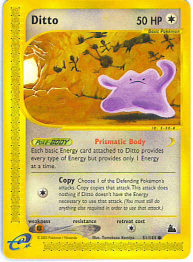 | Type | Colorless | | Pokemon serie | Skyridge | | Stadie | Basic | | HP | 50 | | Sjældenhed | Common | | Tilbagetrækning | 1 | | Svaghed | F | | Kortnummer | 51 | | Evne | [C] Copy - Choose 1 of the Defending Pokemon's attacks. Copy copies that attack. This attack does nothing if Ditto doesn't have the Energy necessary to use that attack. (You must still do anything else required in order to use that attack.)