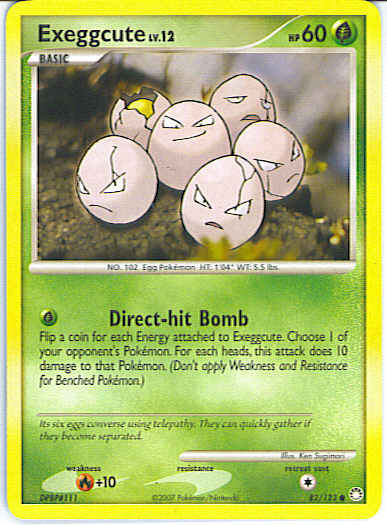 Evne [G] Direct-hit Bomb - Flip a coin for each Energy attached to Exeggcute. Choose 1 of your opponent's Pokemon, and this attack does 10 damage to that Pokemon for each heads you flipped.