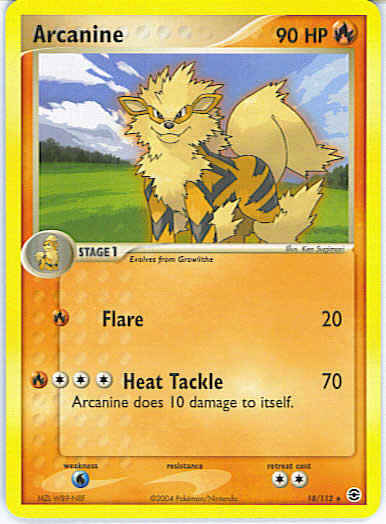 | Type | Fire | | Pokemon serie | Fire Red Leaf Green | | Stadie | Stage 1 | | HP | 90 | | Sjældenhed | Rare | | Tilbagetrækning | 2 | | Svaghed | W | | Kortnummer | 18 | | Evne | [R] Flare (20) [CCCR] Heat Tackle (70) Arcanine does 10 damage to itself. | | Evne2 | [R] Flare (20) [CCCR] Heat Tackle (70) Arcanine does 10 damage to itself. | | Kunstner | Ken Sugimori |