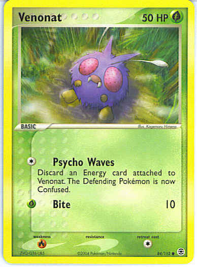 | Type | Grass | | Pokemon serie | Fire Red Leaf Green | | Stadie | Basic | | HP | 50 | | Sjældenhed | Common | | Tilbagetrækning | 1 | | Svaghed | R | | Kortnummer | 84 | | Evne | [C] Psycho Waves - Discard an Energy card attached to Venonat. The Defending Pokemon is now Confused. [G] Bite (10) | | Evne2 | [C] Psycho Waves - Discard an Energy card attached to Venonat. The Defending Pokemon is now Confused. [G] Bite (10) | | Kunstner | Kagemaru Himeno |