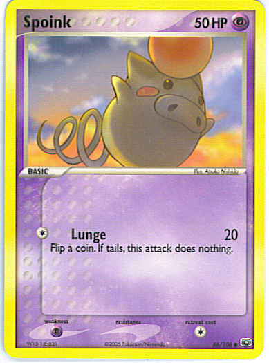 | Type | Psychic | | Pokemon serie | Emerald | | Stadie | Basic | | HP | 50 | | Sjældenhed | Common | | Tilbagetrækning | 1 | | Svaghed | P | | Kortnummer | 66 | | Evne | [C] Lunge (20) Flip a coin. If tails, this attack does nothing. | | Evne2 | [C] Lunge (20) Flip a coin. If tails, this attack does nothing. | | Kunstner | Atsuko Nishida |