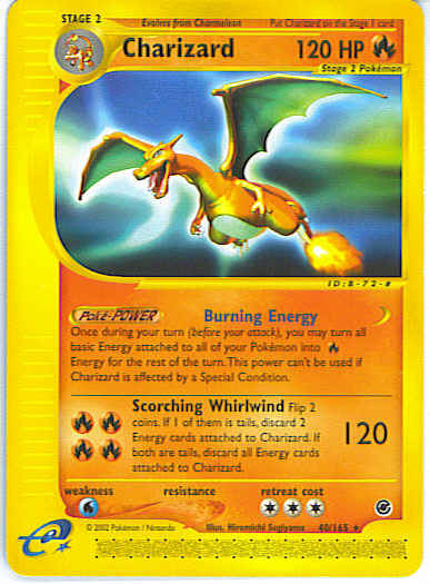 | Type | Fire | | Pokemon serie | Expedition | | Stadie | Stage 2 | | HP | 120 | | Sjældenhed | Rare | | Tilbagetrækning | 3 | | Svaghed | W | | Kortnummer | 40 | | Evne |