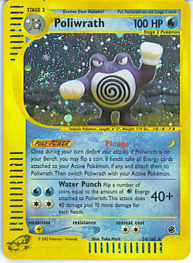 | Type | Water | | Pokemon serie | Expedition | | Stadie | Stage 2 | | HP | 100 | | Sjældenhed | Rare | | Tilbagetrækning | 2 | | Svaghed | L | | Kortnummer | 24 | | Evne |