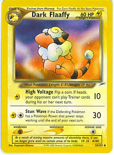 | Type | Lightning | | Pokemon serie | Neo Destiny | | Stadie | Stage 1 | | HP | 60 | | Sjældenhed | Uncommon | | Tilbagetrækning | 1 | | Svaghed | F | | Kortnummer | 34 | | Evne |