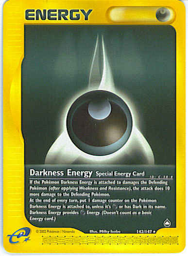 Evne2 Energy Card If the Pokemon Darkness Energy is attached to damages the Defending Pokemon with an attack (after applying Weakness and Resistance.), the attack does 10 more damage to the Defending Pokemon. At the end of every turn, put 1 damage counter on the Pokemon Darkness Energy is attached to, unless it's D or has Dark in its name. Darkness Energy provides D Energy. (Doesn't count as a basic Energy card.)