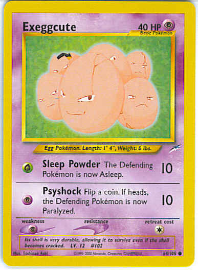 | Type | Psychic | | Pokemon serie | Neo Destiny | | Stadie | Basic | | HP | 40 | | Sjældenhed | Common | | Tilbagetrækning | 1 | | Svaghed | P | | Kortnummer | 64 | | Evne |