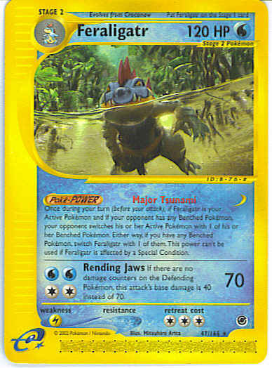| Type | Water | | Pokemon serie | Expedition | | Stadie | Stage 2 | | HP | 120 | | Sjældenhed | Rare | | Tilbagetrækning | 3 | | Svaghed | L | | Kortnummer | 47 | | Evne |